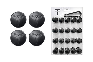 Removing your Model 3 'Pinwheel' Aero Covers? Get a set of Tesla Factory Gray Center Caps and a T Sportline Wheel Lug Nut Cover Set in Matte Black to clean up the look of the base wheel.
