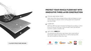 Protect your vehicle floor carpet with innovative three-layer construction floor mats. MAXpider 3D Kagu is the latest and greatest design. The mats are stylish and non-toxic! Sleek carbon fiber texture design enhances style and elegance to your Tesla. Keep your Tesla's interior looking stylish and clean. The soft foam XPE inner layer minimizes foot fatigue by providing cushion for your feet to rest on. It also provides a layer that dampens noise, further offering a smoother and quieter ride in the cabin. The patented anti-skid bottom layer keeps the mats in place without damaging the original carpet like other inferior mats or velcro systems.