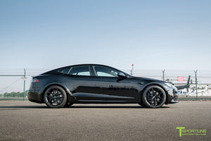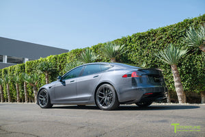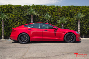 Yes, 20x10" TS5 wheels fit your factory Tesla center caps. They also fit your factory TPMS, and your factory lug nuts. In other words, there's no need to use any aftermarket hardware.