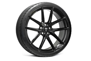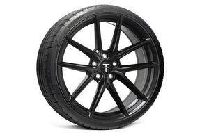 Yes, 21" TSF wheels fit your factory Tesla center caps. They also fit your factory TPMS, your factory lug nuts, and your factory tires. In other words, there's no need to use any aftermarket hardware.