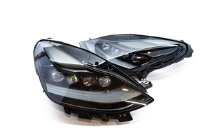 These Tesla Model 3 / Y LED headlights are designed with LED DRLS and LED Projectors for low and high beam functions. The amber LED turn signal is sequential.