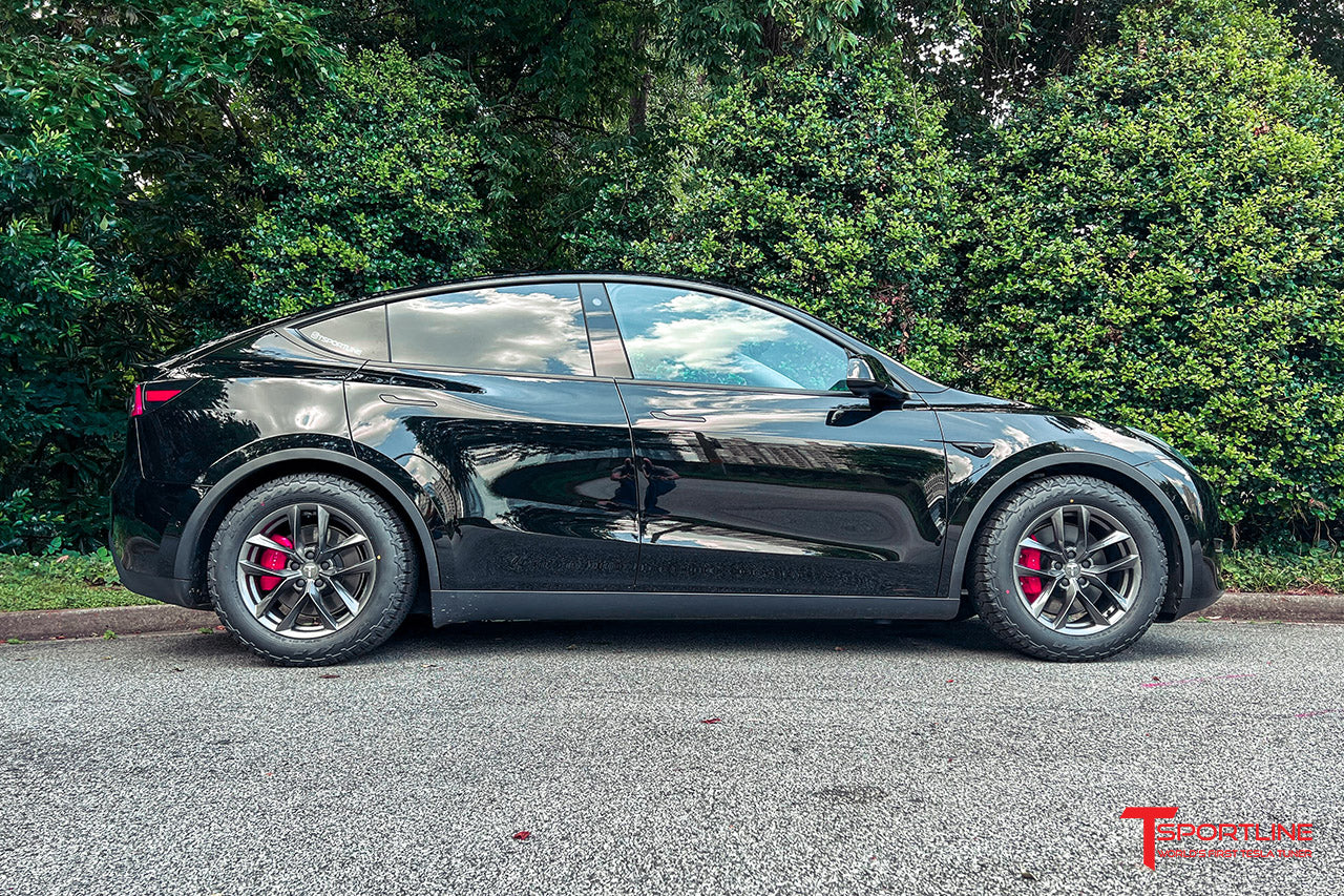 T Sportline's ASPEN CHARGED EDITION Model Y: For the ultimate in performance, T Sportline recommends adding our lift kit, skid plates, bull bar brush guard, and overlanding wheel and tire package to your Tesla Model Y. The added ground clearance and proper tire specification will give extra confidence for more advanced overlanding. Vehicle lifting is optional, not required. T Sportline overland wheel and tire kits will bolt on and fit a stock Tesla Model Y without any lift.