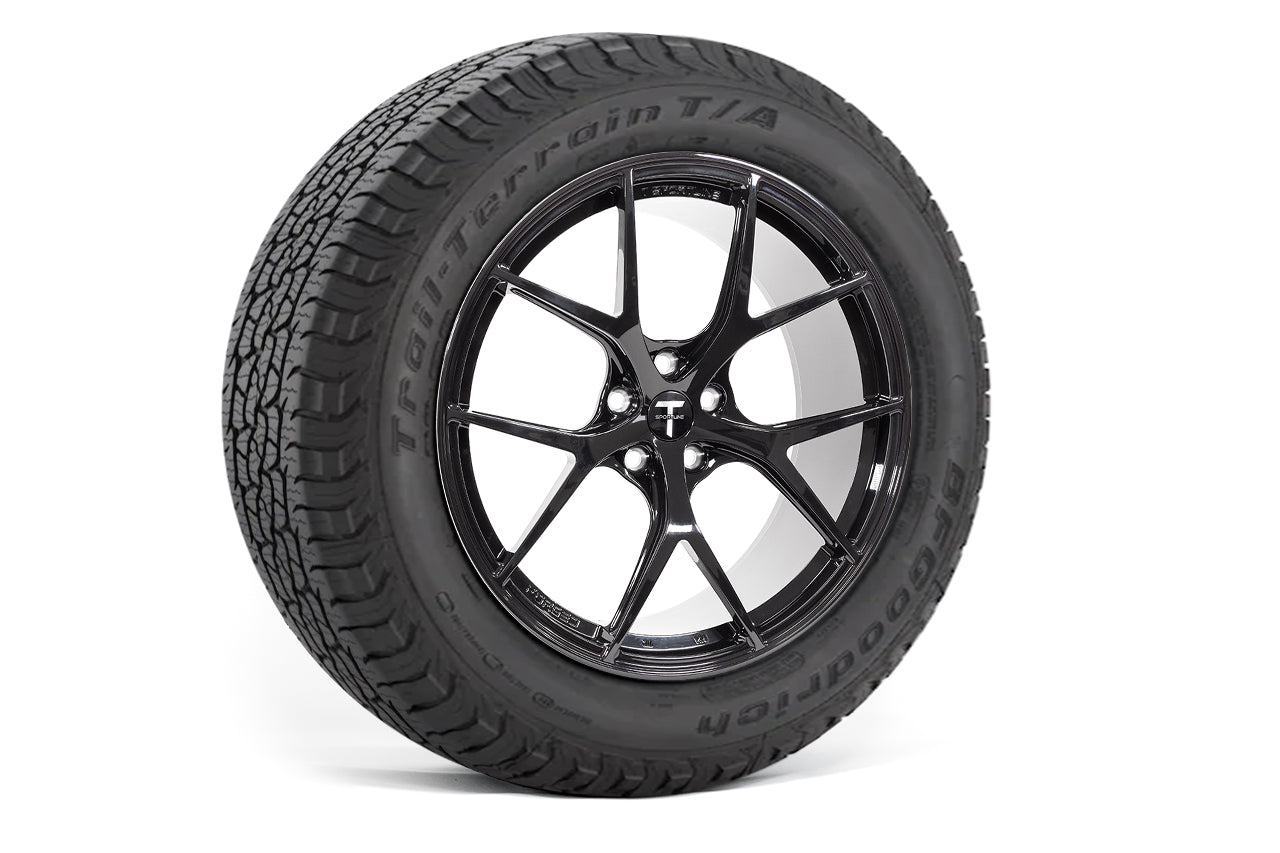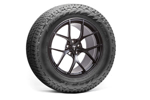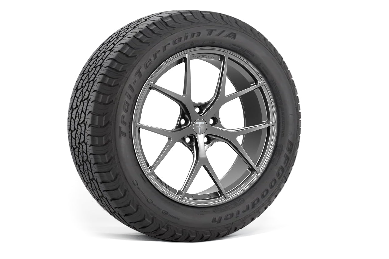 T Sportline is pleased to announce the world’s first official overlanding forged wheel and tire package for Tesla Model Y. This combo will bolt right onto any Tesla Model Y without modifications and immediately transform your Model Y into a capable overlander. The T Sportline 18” TXL forged wheel not only looks great, it provides upgraded strength over stock, suitable for the harshness that accompanies overland and off-road terrains. Thanks to TXL’s forged structure, the wheels also net a weight savings vs factory cast Tesla wheels. The resulting reduction in unsprung weight aids in improving suspension stability during overlanding. Ride comfort quality is also improved with 18" tires, due to the added sidewall (+0.450") cushion. The 18" tire package creates the most cushion to safeguard against damage while overlanding. The 4.8" tall sidewall also reduces the likelihood of 'curbing' your wheels, as commonly occurs on lower profile / larger diameter setups.