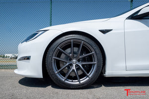 Yes, 20x10" TSF wheels fit your factory Tesla center caps. They also fit your factory TPMS, and your factory lug nuts. In other words, there's no need to use any aftermarket hardware.