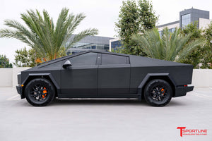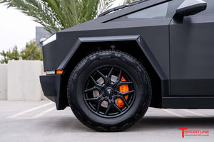 T Sportline designers and engineers created the TCT wheel for Tesla Cybertruck from a clean sheet with a strategic vision of bringing a wheel design to market that would look like a factory Tesla upgrade option.   With over ten years experience making Tesla upgrade wheels, the T Sportline team hit this design out of the park.  This TCT Cybertruck rim looks great while bringing a distinct sporty vibe together with the functional performance gain in strength and reduced weight resulting from the flow formed manufacturing process - a perfect match for any Cybertruck variant, RWD or AWD or Cyberbeast!   As with all T Sportline wheels, the Cybertruck TCT wheel works with factory Tesla lug nuts, TPMS sensors, and center caps along with featuring a Tesla hub spec, and retains a fitment that ensures no issues and no tire 'rubbing'.