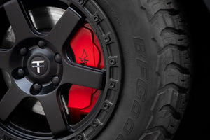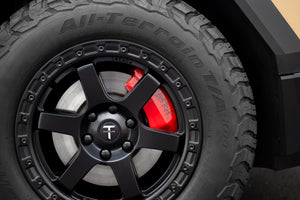 The Tesla Cybertruck comes with raw aluminum calipers, no factory colors or finish options.  T Sportline's design engineers have done it again!  These bolt-on caliper covers have been designed with DNA to match the look of Tesla 'Performance' brake calipers.  Once installed, these covers are practically indistinguishable from Tesla's Performance Brake calipers.   Designed and manufactured exclusively by T Sportline for a precision fitment on Cybertruck factory calipers, no other caliper cover compares.   These have been engineered specifically to bolt-on to Tesla Cybertruck and Cyberbeast calipers.  The installation is DIY friendly, no special tools are required.  The T Sportline DIY Cybertruck wheel & tire tool kit will enable pulling your Cybertruck wheels off at home, to install these sporty brake caliper covers.  The fitment over factory calipers is perfect and rattle-free thanks to the die-cast manufacturing precision on these T Sportline exclusive caliper covers.