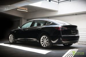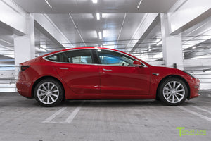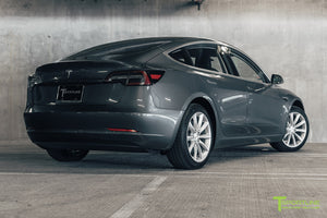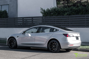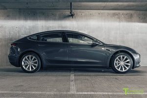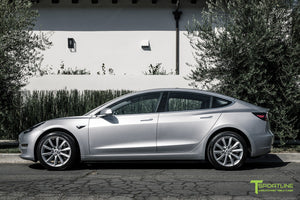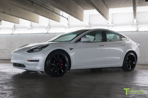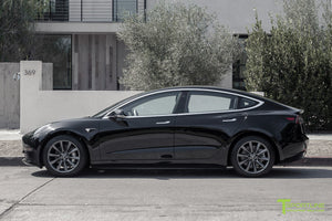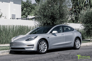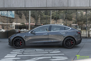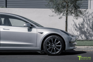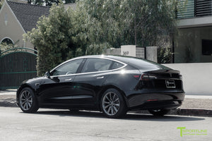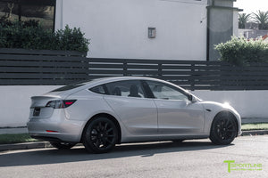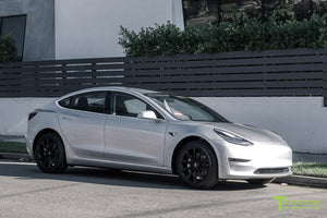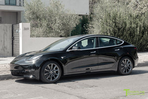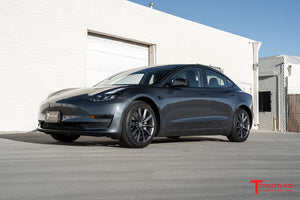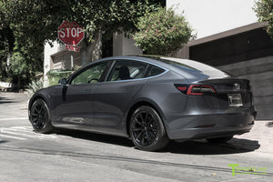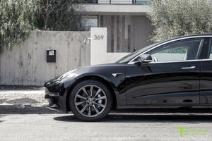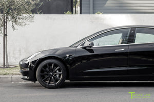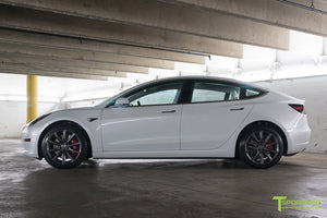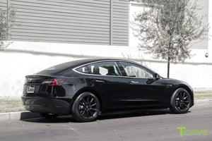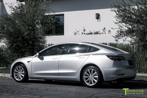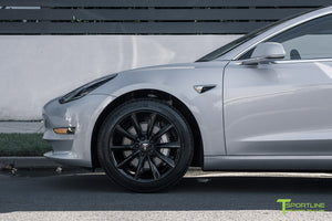 Yes, 18x8.5" TST wheels fit your factory Tesla center caps. They also fit your factory TPMS, factory 235/45-18" tires, and your factory lug nuts. In other words, there's no need to use any aftermarket hardware.