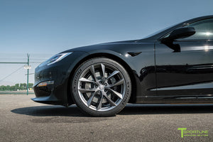 Yes, 20x10" TSS wheels fit your factory Tesla center caps. They also fit your factory TPMS, and your factory lug nuts. In other words, there's no need to use any aftermarket hardware.