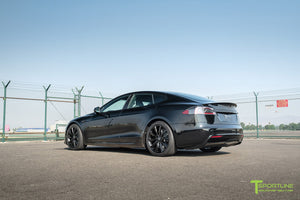 Yes, 20x10.0" TST wheels fit your factory Tesla center caps. They also fit your factory TPMS and your factory lug nuts. In other words, there is no need to use any aftermarket hardware.