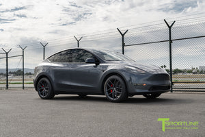 Yes, 20x10" TS5 wheels fit your factory Tesla center caps. They also fit your factory TPMS, factory 255/40-20" tires and your factory lug nuts. In other words, there's no need to use any aftermarket hardware.
