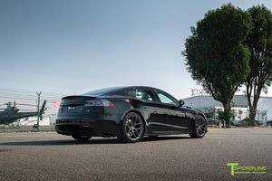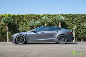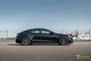 Yes, 20x10" TS5 wheels fit your factory Tesla center caps. They also fit your factory TPMS, and your factory lug nuts. In other words, there's no need to use any aftermarket hardware.