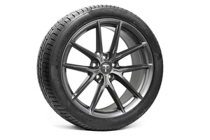 Yes, 20x10" TSF wheels fit your factory Tesla center caps. They also fit your factory TPMS, and your factory lug nuts. In other words, there's no need to use any aftermarket hardware.