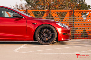 Yes, 21" TSF wheels fit your factory Tesla center caps. They also fit your factory TPMS, your factory lug nuts, and your factory tires. In other words, there's no need to use any aftermarket hardware.