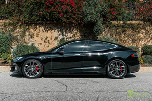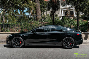 Yes, 20x9.0" and 20x10" TSS wheels fit your factory Tesla center caps. They also fit your factory TPMS, and your factory lug nuts. In other words, there's no need to use any aftermarket hardware.