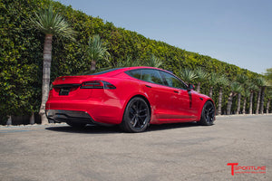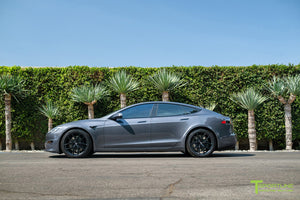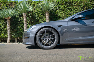 Yes, 20x10" TS5 wheels fit your factory Tesla center caps. They also fit your factory TPMS, and your factory lug nuts. In other words, there's no need to use any aftermarket hardware.
