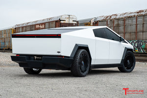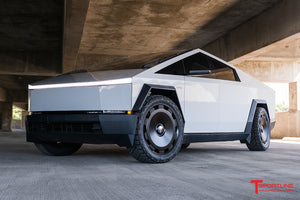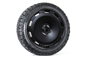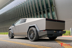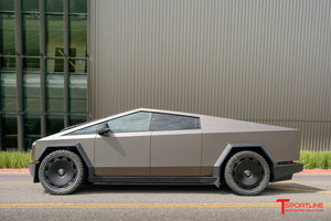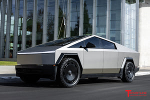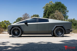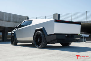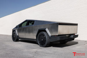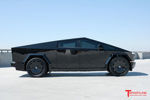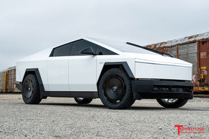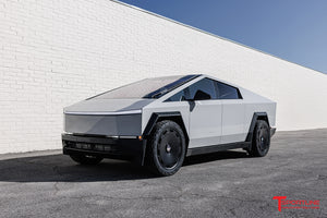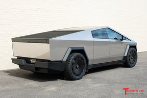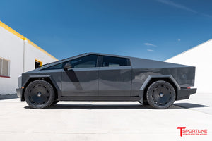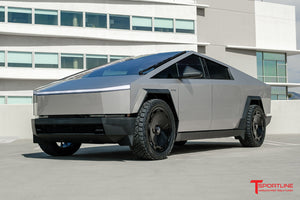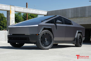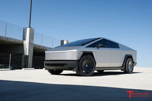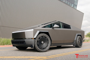 T Sportline's new 24" TCM (Tesla Cybertruck Monoblock) fully flow forged wheel and tire package has been engineered specifically to exacting dimensions to create an aerodynamic range preserving flat face monoblock look wheel while retaining proper structural integrity for spirited Tesla Cybertruck driving. This massive, yet functional Cybertruck wheel is a monoblock wheel built for lasting endurance in all driving environments with the full strength confidence needed to survive the worst of road conditions. The TCM wheel also features our exclusive fully floating center caps for the distinguished and tastefully hidden lug nut look. As you drive, the center caps 'float' in free rotation and the T Sportline grafitti logo remains horizontal at all times.