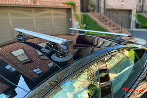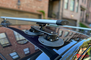 The articulating frame is flexible by design and will conform with body or glass curvature, while providing a confidently rigid mounting structure. The front mount is secured using four (4) TreeFrog vacuum mounts while the rear rack uses two (2) vacuum mounts. Vacuum pumps enable effortless installation. Removal is quick and easy, by just releasing the vacuum and lifting off the rack. This rack fits virtually any car! Designed for use with all types of cargo, up to 88 lbs.