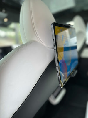 Finally! An easy and safe way to mount your screen devices in the backseat of your Tesla Model S / X This tablet mounting bracket secures to the rear side of the front seats providing the proper viewing angle for back seat passengers. The mount works with any tablet device, up to 11" iPad Pro or equivalent. The securing clamps are spring loaded, opening to fit the device then clamping on the edges. The mounting bracket is overlayed with protective polymer coating to prevent scratches to the screen device or your Tesla. The bracket folds up nicely to keep it tucked out of the way when not in use. Made from injection molded ABS plastic, the device is secure but not bolted on rigid so expect some minor movement when transversing things like speed bumps.